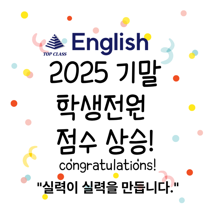 이번에 기말고사 준비를 해서 모든 중학생 친구들이 4점~20점 이상 점수를 상승시켰어요 ^^ 또 중간고사때 100점 맞은 친구는 또 100점을 받아왔어요 이는 주말 보충, 직전보강도 없이 이룰 수 있었던 결과물입니다. 공부는 시간도 중요하지만 올바른 방법으로 공부하는것이 중요해요. 탑클래스 영어에서는 학생들이 더 중요한 수능을 향해 달려가도록 형틀을 잡아주고 있기 때문에 중등 내신에 관해서는 핵심 강의로 학생들이 시험대비를 준비시키고 있습니다. 학기말에 초등부는 간단한 파티를 해요 ㅎㅎ 이에 너무 좋게 봐주셔서 감사드립니다. 초등부의 영어교육 방향성은 중,고등과는 달라요. 따라서 분위기도 살짝 다르답니다. 교육 전문가....... <img src="https://blogthumb.pstatic.net/MjAyNTEyMjNfMTU2/MDAxNzY2NDgwNjQ5Njky.jXH2FJUMXZ-YJEI0cL1K8CIZhN0ZuVt_vWoVVVuutwUg.H2MkYTJFvZhUiv7LMzHhIy4XtmRZAU3E477Y2MpSIJgg.PNG/image.png?type=s3" />