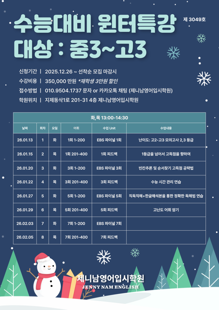안녕하세요, 제니 원장입니다. 25년도 얼마 안 남았네요. 아쉬운 마음을 뒤로하고 2026년 수능대비특강을 진행하고자 합니다. 중3-고1,2 학년은 수능의 감을 익히고 고3 학생들은 수능 공략법에 대해 배우는 시간이 될 것 같습니다. 재원생이 아닌 학생도 수강 가능하니 편하게 문의주세요! 감사합니다. <img src="https://blogthumb.pstatic.net/MjAyNTEyMjZfMTg3/MDAxNzY2NzQ3NjkxNjA3.Mhbh7AfVBMFcHrwmXxpmtkpZBOlQaiXLO7HI8QKVkTcg.xAdzpXIc9F3Du0NZS7zTasWSzfsgcbnrQo3AZMqMExgg.PNG/%C1%A6%B8%F1%C0%BB_%C0%D4%B7%C2%C7%D8%C1%D6%BC%BC%BF%E4_%281%29.png?type=s3" />