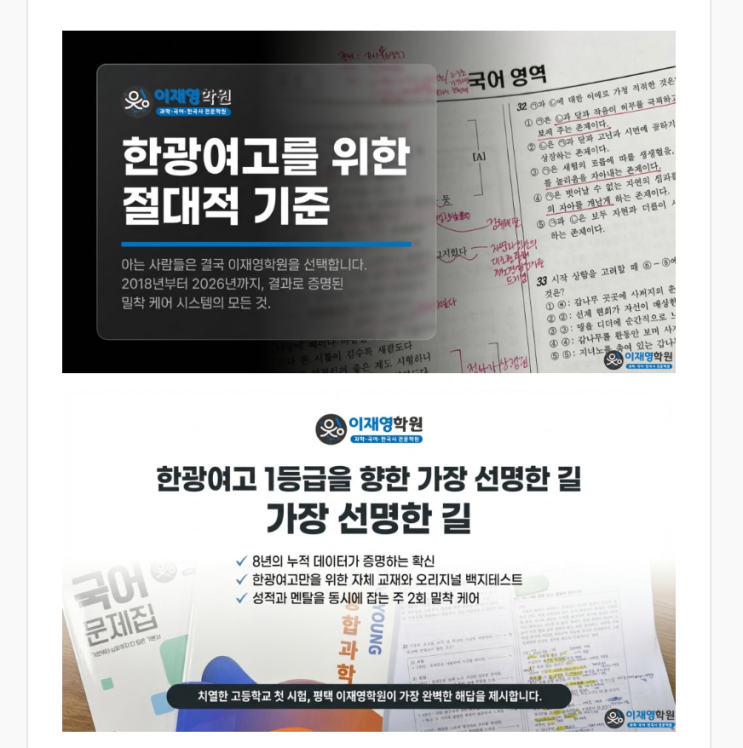 평택 한광여고 전문 입시 학원 이재영 학원입니다. 2026년 1학기 중간고사를 준비하면서 이재영 학원에서 진행하고 있는 한광여고 케어 프로그램을 살 짝 살펴보도록 하겠습니다. 한광여고를 위한 절대적 기준 개원부터 한광여고 반은 끊임없이 개설되고 가장 많은 학생들이 함께 수업을 했던 학교입니다. 그러다 보니. 다양한 학생들의 성향과, 여고생 특유의 디테일함까지 함께 확인하고 밀착 케어해 드리고 있습니다. 한광여고 전문반으로 구성된 이재영 학원에서는 국어, 과학 과목 모두 종합반이 아닌 한광여고 전문반으로 2026년 준비해 드리고 있습니다. 몰입할 수 있는 수업을 진행해 드리면서 학생들과 강사진 사이에서도 끈끈한 지식 교....... <img src="https://blogthumb.pstatic.net/MjAyNjA0MDhfMTE4/MDAxNzc1NjQyMzMwNzQw.T7vD0z4cALKySmU1MFurlnuS4_N_-3cJLWqOUYn-rScg.u_SUibryTZIFI_Ng_Lfs_z9vrI1f1M3ZRftkRy4rky0g.PNG/%BD%BA%C5%A9%B8%B0%BC%A6_2026-04-08_%BF%C0%C8%C4_6.39.37.png?type=s3" />