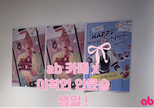 안녕하세요 ab엔터테이먼트 입니다! 오늘은 ab엔터의 히트작! <이세계 착각 헌터>와 ab카페의 안윤승 생일 카페 드디어 오늘 ! 오픈 했습니다 팬이라면 절대 놓칠 수 없는 이벤트, 바로 럭키 드로우 실루엣까지 공개됐는데요! 오늘부터 진행되는 만큼, 현장에서 바로 참여 가능한 꿀정보 정리해드릴게요 [이벤트 운영 안내] 장소: ab카페 3F 굿즈 수령존 운영 시간: 4월 1일 (수) 13:00 ~ 20:30 (오늘 하루!) 오늘 밤 9시 전까지 꼭 방문해야 참여 가능! 럭키 드로우 참여 방법 ab카페 3층 키오스크에서 뽑기권 구매 (※ 1인 최대 10회 참여 가능) 영수증 출력 필수! 직원에게 영수증 제시 확인 후 도장 받고 럭키 드로우 참여! 하는 방식....... <img src="https://blogthumb.pstatic.net/MjAyNjA0MDFfMTc1/MDAxNzc1MDE5Mjc1ODQ5.3_0hr0yHqrhcpE0SpPqskun1yctmLgmbbJlVN4UQixIg.YKkIjt0qWP7CswNT0zosZf6fWY_xWUG5Ag_i5buotJcg.PNG/image.png?type=s3" />