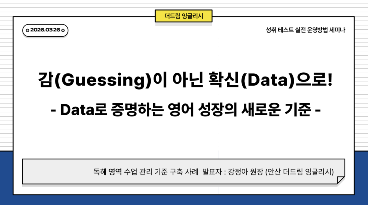 안녕하세요 ^^ 더드림잉글리시 원장 크리스틴입니다 ^^ 3월 26일 목요일 전국의 300명의 넘는 원장님들이 참석하신 가운데 교재 성취테스트 세미나 강사로 원장님들께 귀한 인사이트를 제공해드렸습니다 ^^ 저는 교재 성취세미나에서 '독해'영역 수업관리 기준 구축 사례 발표를 했습니다 ^^ 세미나 후 많은 원장님들께서 귀한 피드백 주셨다고 넬트 본사에서 연락도 받았습니다 ^^ 성취TEST 세미나(2부) 만족도 및 고객 반응 공유드립니다. 강정아 원장님, 금번 성취TEST 세미나 2부를 진행해 주셔서 진심으로 감사드립니다. 이번 세미나는 총 183명이 만족도 조사에 참여하였으며, 원장님 강의는 4.75점 / 5점으로 매우 높은 만족도....... <img src="https://blogthumb.pstatic.net/MjAyNjAzMzBfNiAg/MDAxNzc0ODI1ODM1NzAw.B6KvHhllrgmAH5d5rt_k7o1MDQGWX06T-PttgSaIs1Yg.G4VCfIQM9NMuYjo0dgC94L0vHUoy34WsWB9GVpoGAhYg.PNG/image.png?type=s3" />