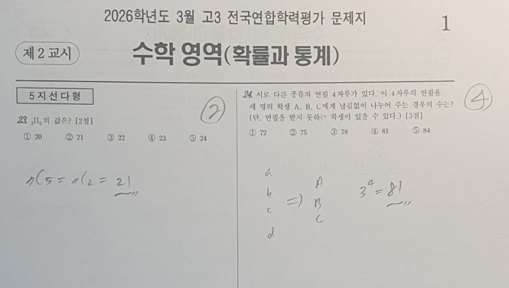 확통과목은 풀이방법에 따라 쉽거나 복잡한 정도의 차이가 큰 내용들이 많습니다. 더 간결한 풀이가 이해는 어렵지만 실력향상에 많은 도움을 줍니다. 고생했쓰요..ㅋㅋ <img src="https://blogthumb.pstatic.net/MjAyNjAzMjZfNzIg/MDAxNzc0NDc4NDIzNjc0.qkdGTjoU19fHwRquhSWJCQdIdDa78qI1cRj1G66qz9Ug.6MoHiiaZFDoaU5stCjesEXbG-BEo1DbaStn54DN0d6Ug.JPEG/900%A3%DF20260326%A3%DF073427.jpg?type=s3" />