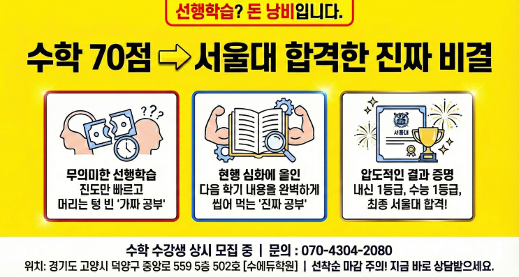 [행신&화정 수학학원] 선행 없이 서울대 합격? 고1 수학70점 역전시킨 수에듀학원