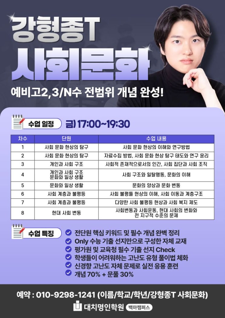강형종T 사회문화 전범위 개념 완성반 예비고2·3/N수생 사회탐구 핵심 강형종T 사회문화 전범위 개념 완성반 사회문화는 단순 개념 암기로는 절대 안정적인 점수가 나오지 않습니다. ✔ 자료 해석 ✔ 개념 적용 ✔ 사회 현상 분석 이 세 영역을 동시에 훈련해야 하는 과목입니다. 강형종T 사회문화 수업은 전범위 개념을 체계적으로 정리하고, 수능형 사고 구조를 만드는 데 집중합니다. 수업 특징 사회문화 전 단원 핵심 개념 구조화 수능 기출 선지만으로 구성한 실전형 자체 교재 평가원·교육청 기출 완벽 분석 학생들이 막히는 자료 해석·고난도 유형 집중 훈련 신경향 문제 대비 실전 응용 문제 제공 개념 70% + 문제 30% 구성으....... <img src="https://blogthumb.pstatic.net/MjAyNjAxMDdfMjYz/MDAxNzY3NzgzMDIwNzQx.2Ulf30PCashwTeTDmgP0V63_uV_mSGdespmbNZk2q18g.tSsI0-bljY-sdpVv7KOdwZ94I_gjpMwiaeUSW8_yUDIg.JPEG/%B0%AD%C7%FC%C1%BE_%BB%E7%B9%AE.jpg?type=s3" />
