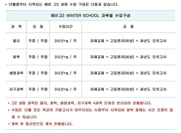 ❚ 예비고2 WINTER SCHOOL PROGRAM 고등학교 2학년은 모든 교과목에서 대학입시에 직결되는 전공과목의 수업이 시작되는 시기입니다. 이에 과목도 좀 더 세분화되고 난이도 역시 매우 어려운 심화단계까지 진행되어 학생들이 공부를 하는데 많은 어려움을 겪는 학년입니다. 과탐 역시 기존 단일과목이던 통합과학에서 물리, 화학, 생명과학, 지구과학 총 4과목으로 분리되어 진행됩니다. 학교에서는 이중 적어도 2개 많게는 4개 과목을 선택하여 수업이 진행됩니다. 내신과 수능에서 모든 교과가 중요하지만 자연계 대학을 진학하고자 하는 학생들은 반드시 과탐에서 최상위 성적을 거두어 상급대학을 진학하기 위한 기초를 다져나야 합니다. 고....... <img src="https://blogthumb.pstatic.net/MjAyNTExMjhfMTUw/MDAxNzY0MzEzOTI5MDM0.Kgb9CdHbgMNjUjzZAx9I9o5fUnmLFpfG0jXiXACKpqog.8cb9EsPxmR39C3X3TFt8pgs1BJ5r7AjnLBOSkiYv-qIg.JPEG/2025-2026_%BB%E7%C0%CC%BE%F0%BD%BA%C5%AC%B7%B4_%C0%A9%C5%CD%BD%BA%C4%F0_%BE%C8%B3%BB%B9%AE-%BF%B9%BA%F1%B0%ED2_%C6%E4%C0%CC%C1%F6_2.jpg?type=s3" />