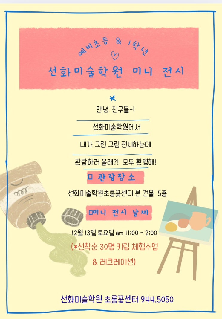 지난 토요일에 #초롱꽃미술학원에서 예비초등부와 1학년 친구대상으로 미니전시를 진행했답니다. 그림그리면서 틈틈이 전시준비했어요. 주제는 "디져트" 달콜한 디져트들을 재료를 활용해서 만들고 그려냈어요^^ 중간에 작업이 어떻게 됬는지 친구들하고 감상도 하구요. 정규수업도 하면서 전시를 준비하는 아이들이 기특해요. 선생님들과 전시 전날에 디스플레이 확인하고 늦은시간 퇴근했답니다. 11시 땡~하고 놀러와준 친구들. 미니전시로 진행했는데 생각보다 부모님들이 많이 와주셔서 바빠지기 시작했어요. 저와 베테랑 선생님 두분은 체험미술진행하기. (이때부터는 너무나 바빠지면서 사진을 남길 수가 없었다는) 슈링클지가 언....... <img src="https://blogthumb.pstatic.net/MjAyNTEyMTJfNzIg/MDAxNzY1NTQwNzU3Nzkz.5AdPvrxnoiEBNZ0JOKvzUZOszyuBRfK_2GeizAi6YPQg.4goGcK1IVeWmuBKOtZbBxAjHR_zfJaTJpsfADXHU2Osg.JPEG/IMG%A3%DF0409.jpg?type=s3" />