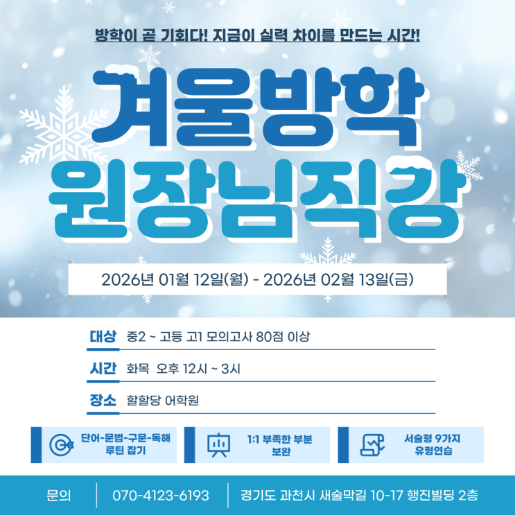 단어–문법–구문–독해까지, 영어 실력을 ‘루틴’으로 완성합니다 방학 특강은 많습니다. 하지만 실력을 ‘쌓는 구조’를 가진 특강은 많지 않습니다. 이번 겨울방학, 할할당 어학원의 원장님 직강 특강은 단순히 문제를 많이 풀거나 진도를 빼는 수업이 아닙니다. 영어 실력이 실제로 만들어지는 순서를 아이의 머릿속에 루틴으로 고정시키는 수업입니다. ✔ 이 특강의 핵심은 ‘루틴’입니다 영어를 잘하는 아이들의 공통점은 분명합니다. 단어 → 문법 → 구문 → 독해가 머릿속에서 자동으로 연결됩니다. 이번 특강에서는 이 과정을 의식적으로 반복 훈련합니다. 단어를 ‘외우는 것’에서 끝내지 않고 문법을 ‘규칙’이 아닌 문장 구....... <img src="https://blogthumb.pstatic.net/MjAyNjAxMDhfMjM2/MDAxNzY3ODU5NTAxOTEw.AHmnXcC6vZYPA07GXiBH3e4ejn7ijT3h0Asq6op_VL4g.MoisenCe_Qy8oKDHt83uCZg05iAlboFhTGVzRatjPKwg.PNG/1212.png?type=s3" />