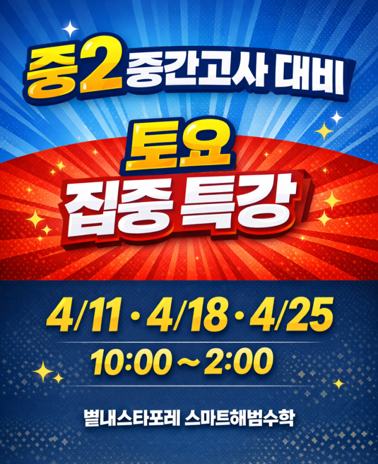 안녕하세요 별내스타포레 스마트해법수학입니다 시험 전 마지막 정리! 개념부터 서술형까지 집중 대비합니다. 수업 일정 4월 11일(토) / 18일(토) / 25일(토) ⏰ 수업 시간 오전 10:00 ~ 오후 2:00 ✔ 시험 범위 핵심 개념 정리 ✔ 학교 시험 유형 문제 풀이 ✔ 서술형 문제 집중 대비 ✔ 취약 단원 집중 보완 중간고사 전 실력을 완성하는 시간 체계적인 관리로 자신감을 키우는 시간 별내스타포레 스마트해법수학 #중2수학 #중간고사대비 #시험대비 #토요수업 #별내수학학원 #별내스타포레스마트해법수학 <img src="https://blogthumb.pstatic.net/MjAyNjA0MDdfNzQg/MDAxNzc1NTcyMzU0NzAy.oZPmzYwwMNOirGfmn_ZL017E8SD1jij8WGyFf3kzO40g.B5F1kA1v56cclGLfPSZnRvD_nuDSEK7giUU6cu7SLYEg.PNG/900%A3%DFfile%A3%DF0000000017787206b640039d104a53ae.png?type=s3" />