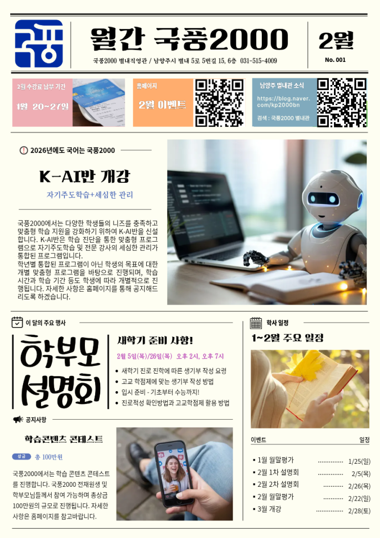 안녕하세요~ 대치빌드업 국어논술학원입니다. 2026년 1월 23일 서울 여의도 국회의원회관에서 '독서국가 선포식 및 독서국가 추진위원회 출범식'이 열렸습니다. 이 행사에서 독서는 국가 생존 전략이며 인간만이 AI를 주도한다고 합니다. 독서를 개인의 취미, 습관, 교육 차원을 넘어 국가 정책과 사회 시스템 차원의 핵심 전략으로 보고 '독서국가'를 공식 선포한 것입니다. 김영호 공동위원장은 "AI 시대 인재의 출발점은 독서역량"이라며 "독서를 통해 사고하고 질문하는 힘을 기르는 것이 국가 미래를 결정짓는 핵심'이라고 강조합니다. 독서를 통해 AI 시대를 살아갈 우리 아이들의 경쟁력을 높이....... <img src="https://blogthumb.pstatic.net/MjAyNjAxMjhfMjAx/MDAxNzY5NTM1NDQwNTY0.JbvHOxdfGCAcE4SAb-BoJH41_ynLDUg97Lyx2eZql48g.S7Mv8YtwOHIAMTOHVqhD3MzLL9WdIecruiePEUh_mSgg.PNG/%C1%A6%B8%F1%C0%BB-%C0%D4%B7%C2%C7%D8%C1%D6%BC%BC%BF%E4__%BA%B9%BB%E7%BA%BB-003.png?type=s3" />