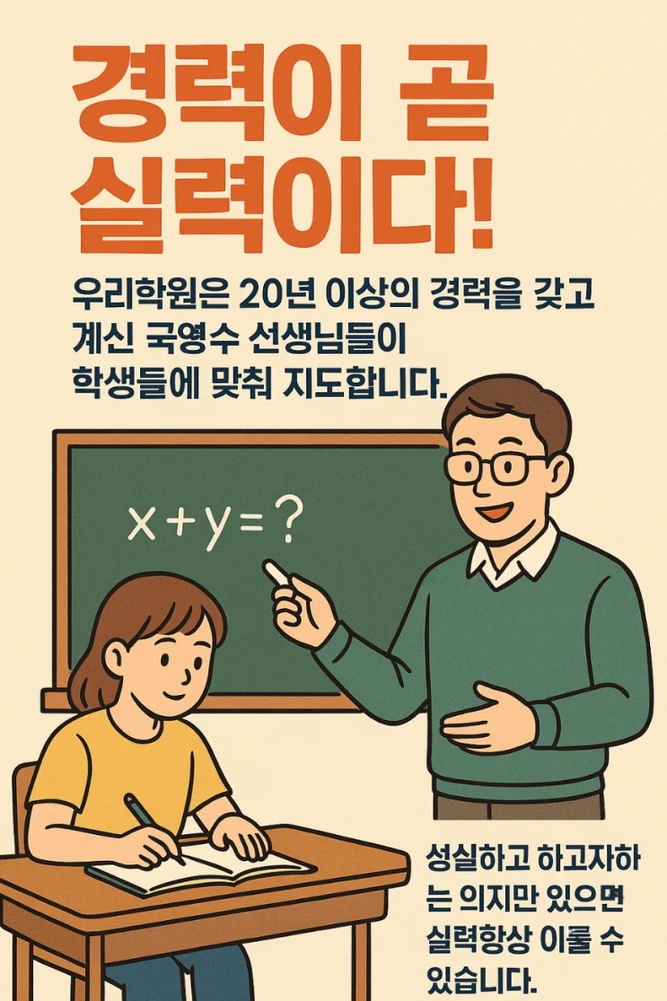 우리학원 1학년 교실에서는 종이가 바스락, 연필이 사각 마치 작은 도서관처럼 따뜻한 소리가 가득했어요. 아이들은 조용히 책장을 넘기고, 마음에 닿은 문장을 천천히 필사해 내려갔습니다. 처음에는 글자를 조금 비뚤게 적던 아이들도 “선생님, 이 문장이 기억에 남아요!” 하며 자신만의 속도로 집중하는 모습이 얼마나 기특한지요. 책 속 문장을 따라 쓰다 보면 글씨만 예뻐지는 게 아니라 생각도 깊어지고, 무엇보다 아이 스스로 ‘할 수 있다’는 자신감이 자라납니다. 우리 학원은 아이들이 억지로 배우는 곳이 아니라, 스스로 즐겁게 성장하는 곳이 되기를 바라는 마음으로 매일 정성껏 수업을 준비합니다. 읽고 쓰는 활동 하나에도 아....... <img src="https://blogthumb.pstatic.net/MjAyNTExMjdfMjI5/MDAxNzY0MjMyOTQ5MjY4.3OWH42YavPmJjqSv4WI39YLucf16hZd5y_Q4pt5zQZcg.t5Ei4yQwTG1anGQ1X3tft7mtupy39nAKnAjRDu2L3lgg.JPEG/KakaoTalk_20250416_154323227_08.jpg?type=s3" />