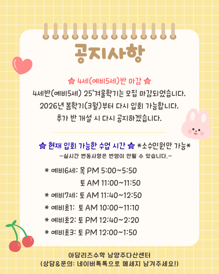 그 동안 최선어학원은 초5·초6 집중 커리큘럼으로 운영되었습니다. “초4반 언제 열리나요?” 그동안 정말 많은 학부모님들이 문의 주셨어요. 드디어! 2026년부터 초등 4학년 정규 클래스가 1월 2일 개강합니다. 최선어학원 초4반, 무엇이 다를까요? •대치동 본원 커리큘럼 •원어민 + 한국인 담임제 •초5·초6까지 이어지는 단계별 학습 레벨테스트 예약은 혼잡을 피하기 위해 예약제로 운영하고 있습니다. 예약및 교육문의 ☎ 031-556-0579 궁금하신 점은 언제든 편하게 문의 주세요. 부모님의 선택에 도움이 되겠습니다. 월 교습비 31만원 <img src="https://blogthumb.pstatic.net/MjAyNTEyMDlfMTQ2/MDAxNzY1Mjc5Mzk0NDY4.NXskeFPL71vWRS0Wca55YxHIy3VVxu6eo-PmlcgldA4g.qs0mVK6Sl4rhj1e-tjAABbRgHFE9s3PTvYIWxxFHgMQg.JPEG/001.jpg?type=s3" />