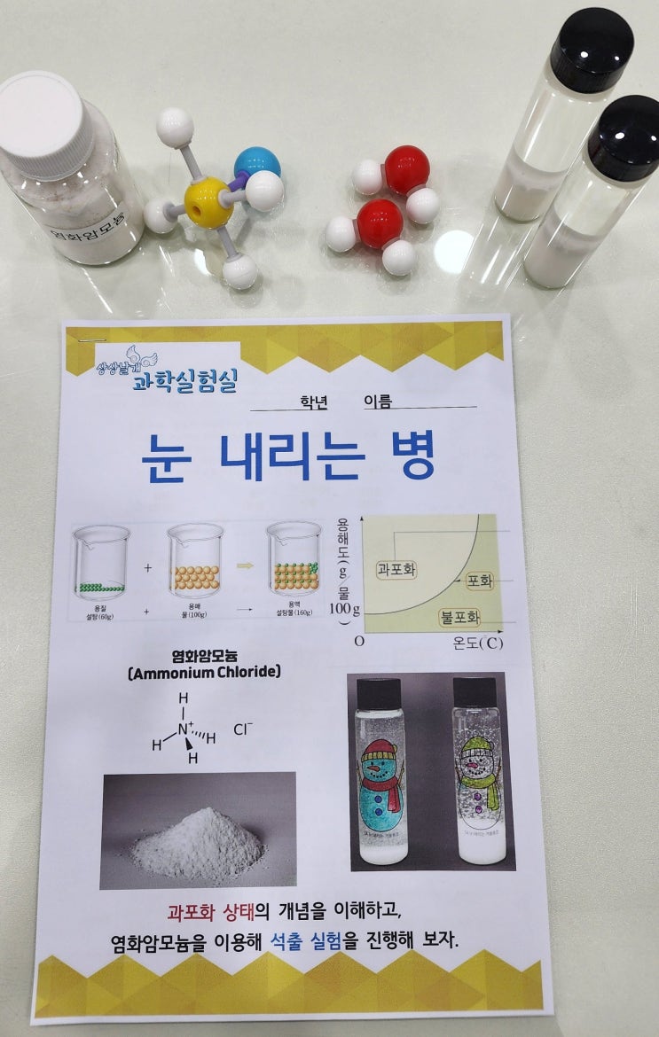 안녕하세요 상상날개 과학실험실 [평내호평점]입니다. 오늘은 아이들이 특히 눈을 반짝이며 참여했던 아주 신기한 과학 실험을 소개해 드리려고 해요. 바로 ❄️ 「눈 내리는 병」 실험입니다! “선생님, 진짜 눈이에요?” “병 안에서 눈이 내려요?” 실험을 시작하기 전부터 아이들의 질문이 쏟아졌답니다. 오늘 실험의 핵심 개념은 바로 ‘과포화 상태’ 입니다. 눈 내리는 병, 어떤 실험일까요? ‘눈 내리는 병’ 실험은 염화암모늄을 이용해 과포화 용액을 만들고, 온도가 내려가면서 결정이 생기는 모습을 관찰하는 활동이에요. ✔ 뜨거운 물에 염화암모늄을 충분히 녹여 과포화 용액을 만들고 ✔ 병에 담아 천천히 식히면....... <img src="https://blogthumb.pstatic.net/MjAyNTEyMjNfMjQ0/MDAxNzY2NDUwNjg5MTc4.XGDc7r4-ANl6Gg4FxEZu5IKFhwRHG341WsPivxmC3sUg.j8Esx-9K1kdHMRNahOpihu07oY4KUpK7aBO0cD2CYesg.JPEG/%B4%AB%B3%BB%B8%AE%B4%C2%BA%B4_%C7%A5%C1%F6.jpg?type=s3" />