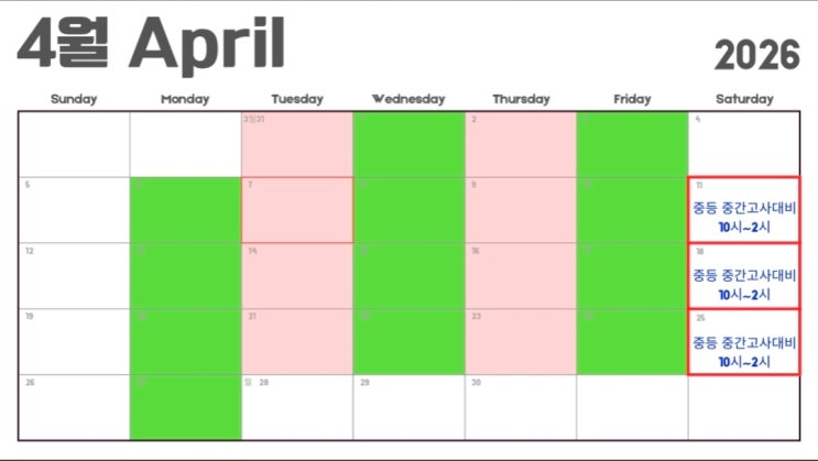 4월 수업 안내 및 중등부 내신 주말 수업 추가 수업 일정