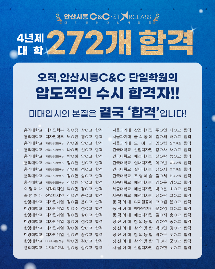 안산,시흥 씨앤씨미술학원 2026학년도 수시 합격자 결과! 치열했던 26학년도 미대입시가 끝이 났습니다! 애쓴 우리 학생들 모두 수고 많으셨습니다. 현재 정시 추가 발표까지 앞두고 있어 모든 결과는 2월 중순에 발표될 예정입니다. 영광의 수시 합격자 먼저 보여드리겠습니다! 안산, 시흥 C&C미술 학원은 2026학년도 수시전형에서 서울, 수도권 및 주요 4년제 대학에서 272개의 합격자(복수 합격자 포함)를 배출하여 전국 미술학원 최고 수준의 합격 결과를 만들었습니다. 더불어 전국 C&C미술학원 중에서도 명실공히 합격률 TOP을 계속 유지하고 있습니다. 미대진학을 꿈꾸는 예비고1 디자인 클래스! 재능보다 노력의 영역인 미대입시....... <img src="https://blogthumb.pstatic.net/MjAyNjAxMjlfMzkg/MDAxNzY5Njc2NTM2OTcx._wbzz0c6crHbL0PDm3Rf_dup9RPK80ohJc14xlB0rSgg.TIvgnN5-H28mfrShwN3mX_nnf-vNcJ6hOTAe286J2l4g.PNG/%B9%E8%B0%F0%BD%C3%C8%AD_%C0%D4%BD%C3%B9%CC%BC%FA1.png?type=s3" />
