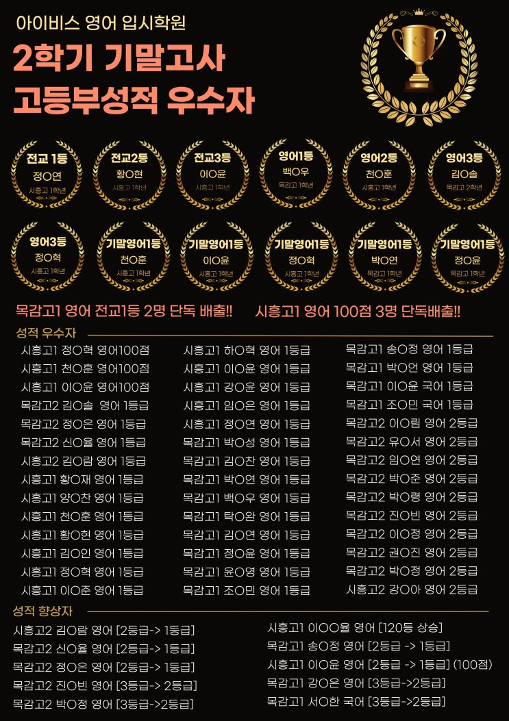 제 시 1339 호 아이비스 목감점 2025학년도 2학기 2차 성적 결과 – 믿고 맡길 수 있는 학원은 이유가 있습니다. 내신/수능 전문학원 아이비스입시 영어학원입니다. 2025년 2학기 2차 지필평가 결과 안내드립니다. “2학기 지필결과는 성적표 기반 전체등수로 등급을 산정하였습니다. 전교권 등수란, 단순히 1등급을 의미하는게 아니라 전체 석차등수를 의미합니다.” 자랑스러운 우리 아이비스 재원생들의 성적우수자 후기글! 아이비스 졸업생들과 함께한 종강 파티 오랜 인고의 시간 끝에 마침내 소중한 결실을 맺어 함께 축하하는 자리를 가졌습니다. 항상 꿈꿔왔던 서울대·연세대·고려대 그리고 그 외의 학교들에서 각자의 길을 멋지게....... <img src="https://blogthumb.pstatic.net/MjAyNjAyMDJfNjEg/MDAxNzcwMDExMzYyNjA5.PDg7sgNsE8sHRVtoNIyqI_M3K1dGJIk6dAWeXo5kZdYg.XwenfwvA1dqwjcMVJOIzQma-GRdxm03d1jc09HwFbmEg.JPEG/2025_2%C7%D0%B1%E2%B1%E2%B8%BB_%BC%BA%C0%FB%BF%EC%BC%F6%C0%DA%C6%F7%BD%BA%C5%CD_%B0%ED%B5%EE.jpg?type=s3" />