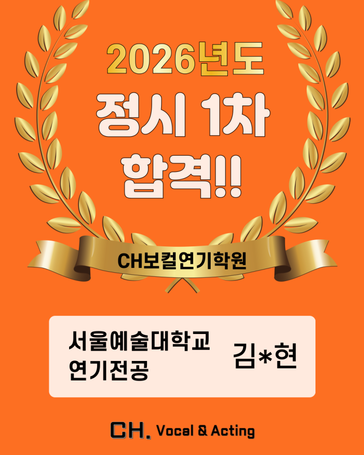 안녕하세요:) CH보컬연기학원입니다~! 연기반 김*현학생이 서울예술대학 연기과 1차에 합격했습니다~! 2차까지 잘 준비하여 최종합격을 받을수 있기를 응원합니다!!!! 보컬&연기전문학원 CH보컬연기학원 CH보컬연기학원에서는 연극영화과 입시에 필요한 ✔️ 연기수업 ✔️ 특기노래 ✔️ 특기무용 ✔️ 질의응답 모든 수업이 가능합니다~! 보컬&연기에 관심이 있는 누구나!! CH보컬연기학원이 기다리고 있습니다 CH보컬연기학원 보컬반 ▫️ 취미반 / 전문반 / 실용음악 보컬 입시반 ▫️ 오디션반 / 축가반 / CCM반 연기반 ▫️ 취미반 / 중고등반 / 연극영화과 입시반 ▫️ 오디션반 / 영화제작반 / 연극공연반 ?....... <img src="https://blogthumb.pstatic.net/MjAyNjAxMjdfMTMw/MDAxNzY5NTA0ODA4MTYw.vOHjpBZ3hSUBbY4lLqPqSRu8zx3Oi6L2KRRiCQBtPdcg._eHMTkeKITv4ULieIso0MldCxbxL-W_DjXRniEHLIRwg.PNG/%B1%E8%B5%BF%C7%F6_%BC%AD%BF%EF%BF%B9%B4%EB_1%C2%F7.png?type=s3" />