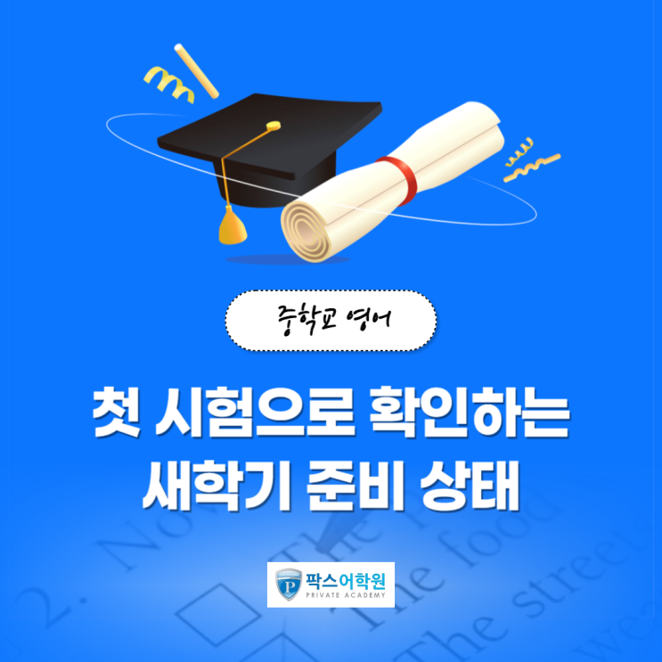 안녕하세요 탄탄한 초등부터 중·고등 내신/수능영어의 최강자! 산본 영어학원 팍스어학원입니다. 중학교 새학기가 시작되면 대부분의 학생과 학부모는 “첫번째 시험은 확인용이지”라고 생각합니다. 하지만 실제로 중학교 영어에서 1년 성적의 흐름을 가장 빠르게 드러내는 시험은 바로 첫 시험입니다. 이 시험은 공부를 얼마나 했는지를 보는 시험이 아니라, 공부 방식이 제대로 잡혀 있는지를 확인하는 시험이기 때문입니다. 그래서 오늘은 중학교 영어 첫 시험의 의미와 새학기 전에 꼭 점검해야 할 공부 포인트에 대해 알아보겠습니다. 중학교 영어 첫 시험이 중요한 이유 첫 시험에서 성적 격차가 크게 벌어지는 이유는 시험 난이도 때문이....... <img src="https://blogthumb.pstatic.net/MjAyNjAyMDVfMTUy/MDAxNzcwMjcxNzg2MTU1.UQZXWLDESBdGmvVlnVkMcB7ccbbQD0KAjD3PP3FxqF8g.TmWa0mf-hSBsL9ZMM0yo9zFZjgazP74veL0Aqq_JzS0g.PNG/%BB%EA%BA%BB_%BF%B5%BE%EE%C7%D0%BF%F8_%281%29.png?type=s3" />