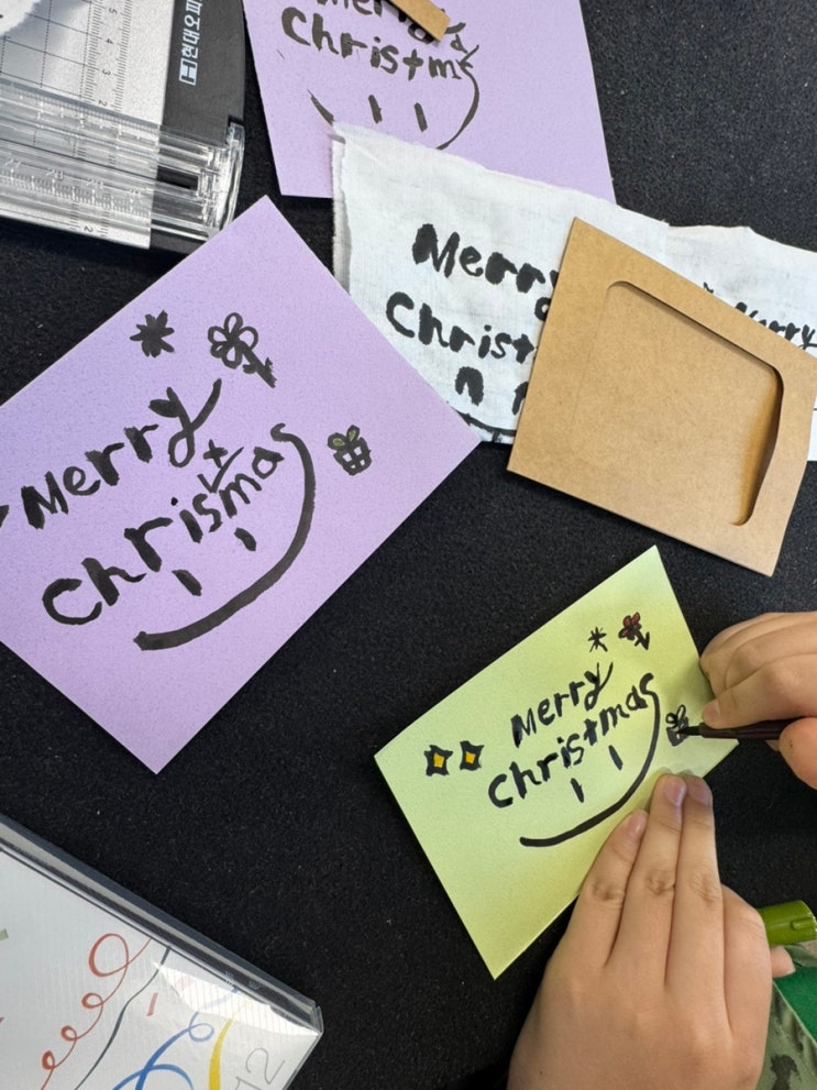 크리스마스가 지나고 나서야 아이들과 함께 만든 크리스마스 카드 연습사진을 올려봅니다. 올해는 색연필이나 스티커 대신, 서예 붓으로 ‘Merry Christmas’를 써보는 수업을 했어요. 붓으로 쓰는 영문 글씨는 아이들에게 조금 낯설 수 있지만, 획의 흐름과 힘 조절을 느끼기에는 아주 좋은 연습이 됩니다. 특히 ‘Merry Christmas’는 리듬감 있는 알파벳 덕분에 붓글씨 연습용으로도 잘 어울리는 문구예요. 아이들 각자 손에 힘을 주는 방식도 다르고, 붓을 움직이는 속도도 달라서 같은 문구라도 모두 다른 분위기의 카드가 완성됐어요. 크리스마스는 내년에도 또 오겠죠. 그때 다시 꺼내볼 수 있도록 올해 아이들의 붓글씨 크리스마스를 기....... <img src="https://blogthumb.pstatic.net/MjAyNTEyMjdfMTA1/MDAxNzY2ODIyOTA1NTky.RUGAuVbIqWdBIfuXighaKMxPDwiNmFV1155L6CQ1ZBkg.ei6BySDUCbSqqKxZyPbiJNE1MN42oDkpgxANfieNON0g.JPEG/IMG%A3%DF6635.jpg?type=s3" />