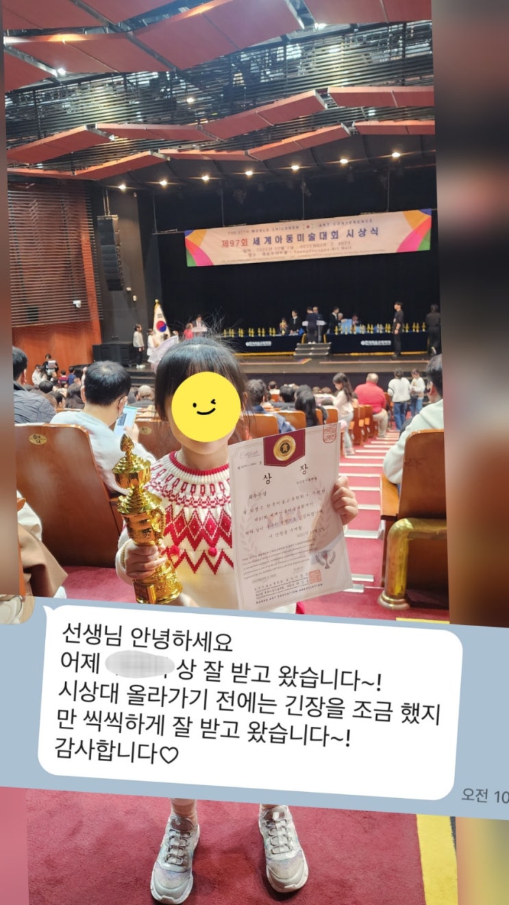 안녕하세요. 상상숲미술학원입니다 최근 상상숲 아이들에게 참 고맙고 뜻깊은 소식들이 이어졌죠~ 아이들의 그림이 상으로 이어지기까지 상상숲미술학원의 교육 철학과 함께 이야기해봅니다. 제97회 세계아동미술대회 상상숲미술학원 참가자 전원이 수상했고 그 중 7세 친구들 전원 최우수상 수상했습니다. 긴장되는 시상식 무대에서도 씩씩하게 상을 받고 내려온 우리 7세 친구들❤️ 이번 시상식에는 개인 일정으로 함께하지 못한 친구들도 있었지만, 상상숲 7세 친구들 전원 최우수상이라는 정말 자랑스러운 결과를 받았습니다. 꼬마 프리다칼로를 찾아라 드로잉 공모전 이 대회는 색을 입히지 않은 순수한 스케치만으로 평가받....... <img src="https://blogthumb.pstatic.net/MjAyNTEyMzBfMTcg/MDAxNzY3MTA1NzI5OTgy.tD3MQT6Rf8VskFHOzPk0uLokzgNZCTQmUTL_1hLhOGEg.RobO2WB_BJeDYSe2wpIoaBEB0qHcsgCxxG-n2byKXJUg.JPEG/900%A3%DF20251221%A3%DF232841.jpg?type=s3" />