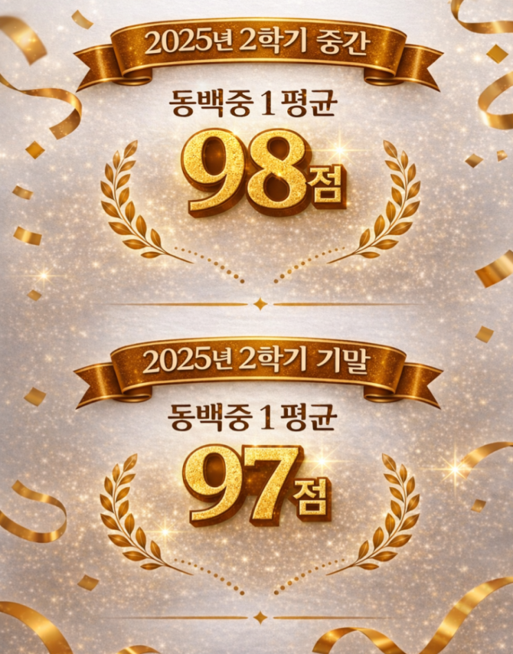 안녕하세요 2025년 2학기 중간고사와 기말고사 결과입니다. JHK 영어의 목표는 내신 성적보다는 진정한 영어 실력 향상입니다 하지만 중학생에게 내신 성적을 위해 최선을 다하도록 가르치는 이유는 영어 자신감✨️✨️ 선생님의 가르침에 따라 열심히 노력한 JHK영어 학생들이 저의 자랑이자 보물입니다. 중 3 - 유종의 미를 거두며 우수한 성적으로 마무리하였고 중 2 - 노력은 배신하지 않는다는 교훈을 얻었고 중 1 - 시험 난이도 올라갔지만 흔들림없이 잘 해냈습니다!! 모두 멋져요♥️✨️✨️ 참 잘했어요 소수정예의 힘! 선생님과의 소통! 열정과 노력! 13년간의 누적된 전문성! JHK영어에서 누려보세....... <img src="https://blogthumb.pstatic.net/MjAyNTEyMzFfMTcg/MDAxNzY3MTEwNTM4MDk1.OX7tdEoZDtZt88xBSD7PmoGQmx4WvD2k46iDO0ehNFAg.98DqeUZUYlgfC0dHXdW9-ene75cGnnwfSlSaRcb50wsg.PNG/900%A3%DFScreenshot%A3%DF20251230%A3%DF200321%A3%DFKakaoTalk.png?type=s3" />