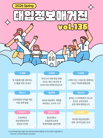 안녕하세요~^^ 이번 입시자료는 대교협에서 제공하는 대입정보매거진입니다. 고교생활의 시작부터 대입의 완성까지 학년별 가이드와 실전 전략의 제시를 보여주고 있습니다. 각 학년별 서로 다른 고민과 학습 로드맵의 제시를 통해, 대입 합격을 향한 구체적인 공략 방법에 대한 실전교본으로서 여러 입시생들에게 도움이되길 바래봅니다. 막막한 입시 터널을 지나고 있는 우리 학생들에게 추상적인 입시전략의 실제가 구현된 여러 예시를 보면서, 입시생 개별 상황에 맞는 여러 입시상담을 통해 도움을 받을 수 있기를 적극 추천합니다. 출 처 : 한국대학교육협의회 대입상담센터 중·고 국어 수학 영어 전문 기흥하이퍼학원 ☎ 교육상담 031-800....... <img src="https://blogthumb.pstatic.net/MjAyNjA0MDJfMjQ1/MDAxNzc1MTIzMjQ4NjAx.AQ9LIvz3Sk2EUK-BYxibfrgV5pdMFcnVzRpqcffIw5sg.x0NFNCjR78_1WnLMQW0QLrXb_IBeGhqfliELf_uO9i0g.PNG/20260402_184337.png?type=s3" />