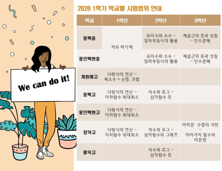 안녕하세요 여러분! 새 학기가 시작된 지 엊그제같은데, 벌써부터 중간고사를 대비하는 시기가 다가오고 있습니다. 특히 1학기 첫 시험은 아이의 학습 방향과 자신감을 결정짓는 중요한 기준이 되기 때문에, 각 학교별 시험 범위를 미리 확인하고 준비하는 것이 무엇보다 중요합니다. 오늘은 용인(동백)지역 주요 학교들의 1학기 시험 범위를 정리해드리니, 학습 계획을 세우시는데 참고해보시기 바랍니다. 학교마다 시험 범위와 출제 경향은 조금씩 다르지만, 결국 중요한 것은 아이에게 맞는 준비 방향입니다. 같은 내용을 공부하더라도 어떤 방식으로 이해하고, 어떻게 반복하느냐에 따라 결과는 크게 달라질 수 있습니다. 저희 [수학에 닿다....... <img src="https://blogthumb.pstatic.net/MjAyNjA0MDNfMjYx/MDAxNzc1MTk3MzQ4MTYw.gYPOhvfQ1gaS0UgPwdDuPqdYAYrqV6ftBMSGt3-gUMYg.gCFqXuxfhrleWeNHXf_0TDOMKz-3OlhGHYHFMG9wOdEg.JPEG/900%A3%DF1775197193580.jpg?type=s3" />