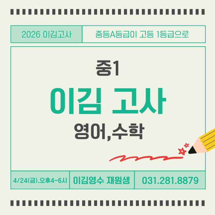 안녕하세요, 중고등부 실전에 강한 보라동 영어, 보라동 수학 이김 영수전문학원 입니다. 자유학기제로 중1학년 1학기에는 학교에서 치르는 정기고사가 없지요 해이해지기 쉬운 중1 시기, 학교 시험이 없는데 공부를 착실히 하는 친구들이 있을까요? 이김 영수학원에서는 매주 주간테스트를 통해 주간 단위로 학습을 점검하고 있습니다. 매년 자체 중간고사인 '이김고사'를 실시하고 있지요. 중 1 친구들의 진지함이 느껴지실까요? 초등에서 중등으로 이어지는 중1 시기, 용어와 개념을 정립하고 식을 세우는 방법 등 제대로 배워야 할 게 많은데요. 이 부분의 학습 결손이 있으면 중2,중3까지 발목을 잡는 경우가 많습니다. 시간을 그....... <img src="https://blogthumb.pstatic.net/MjAyNjA0MDZfNTgg/MDAxNzc1NDYwMzQ0MTQy.qWWP7o-PTrbQLzR559R9S_TzTSIyTV-uPyvDeSAchrMg.RhysANOOnwFmneo-Eb9bDzgmAGKtRy-jKZEL26a7Q1Qg.JPEG/KakaoTalk_20260406_161710861.jpg?type=s3" />