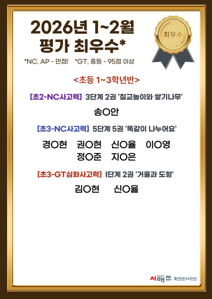 [NC/AP/GT/중등] 1~2월 평가 최우수! ✨NC사고력 형성평가 만점 ✨AP사고력 단원평가 만점 ✨GT심화사고력 형성평가 95점 이상 ✨중등 대단원평가 95점 이상 배우고 학습한 개념을 복습하고, 질문하고, 깨닫고, 이해하고, 유레카~~~! 100점이라는 점수는 최선을 다한 아이들의 노력을 보여주는 지표라 생각합니다. 새학기에도 화이팅~! <img src="https://blogthumb.pstatic.net/MjAyNjAzMTJfNzQg/MDAxNzczMjkwOTQ0Njkw.QCzNEOkM6lNcxjFfMmIjEXaB7pwKRsMKnSM1Zv4jGxwg.THc-DBi_TMPRIPgX8HXWIOWZR8m_DApTm4s0uYiDVLsg.PNG/001.png?type=s3" />