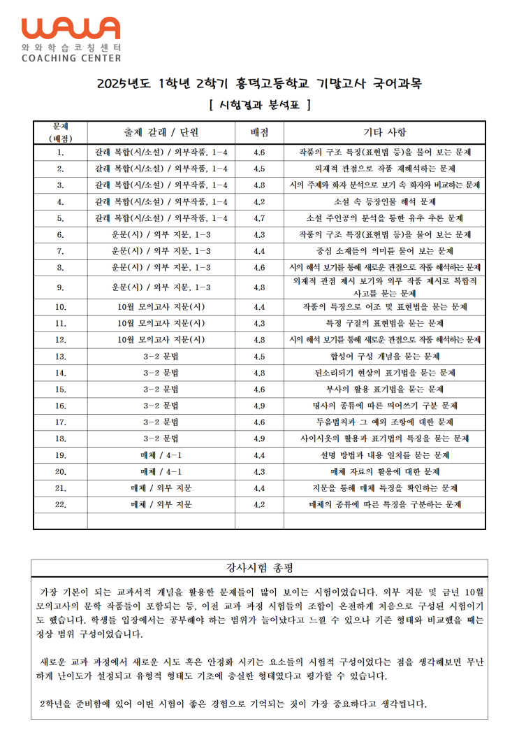 2025년 흥덕고등학교 1학년2학기 기말고사 국,영,수 시험지분석