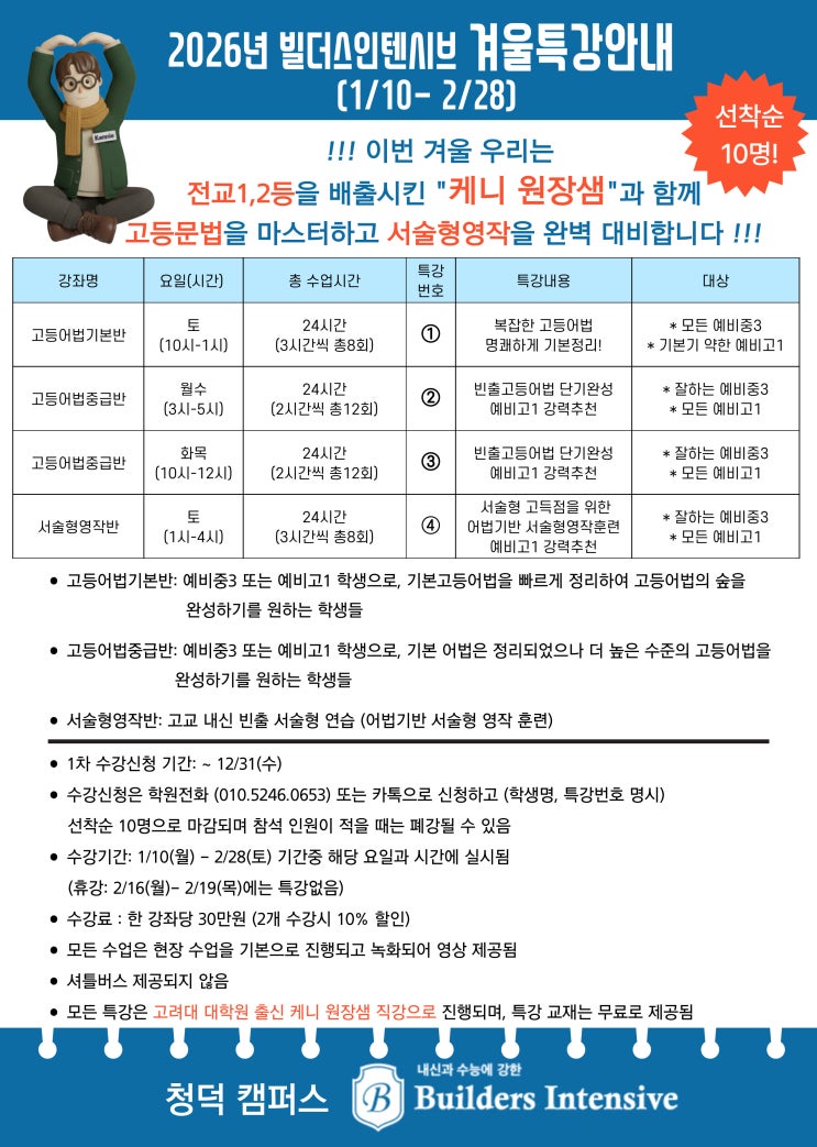이번 겨울에는 예비중3과 예비고1을 위한 고등어법 기본/중급과 서술형영작을 준비했습니다. 모든 특강은 고려대 대학원출신 케니원장샘의 직강으로 진행되면 선착순 10명입니다^^ 고등영어는 역시 영어전문 빌더스인텐시브!!! <img src="https://blogthumb.pstatic.net/MjAyNTEyMjhfMzUg/MDAxNzY2OTI5NDk5Nzgy.RztSh2Wrcx-lOVJaryPRfBuNfKnlcKpXfguxMUOw4hwg.yB4ZLoFCrmR3yDaujw_xQ8Alq3Fmdx1ucDbO-P4Oqhkg.JPEG/%C3%BB%B4%F6%C4%B7%C6%DB%BD%BA.jpg?type=s3" />