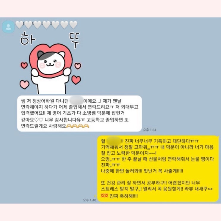 용인 동천초 영어_손곡초 영어_고맙고 기특한 내새꾸 안녕하세요 Sophia tr입니다! 오늘은 저랑 같이 했던 아가들 자랑입니다아 정말 감사하게 10년 동안 늘 다정하고 노력해주는 아이들이 함께해줬습니다 처음 과외를 할 때, 처음 판서를 할 때 분명 부족한 점이 많았들텐데 늘 예쁜 마음을 내어준 친구들 덕분에 저도 더 마음을 잡고 수업을 했습니다 나름 쪼(?) 가 있어서 혼낼 때는 너무 뼈를 때리는게 아닐까, 상처를 준건 아닐까 하는 걱정을 하는데요. 우기 아가들은 포근하고 넓은 마음으로 제가 하는 이야기를 언제나 받아들여줬답니다:) 또 언제나 포기하지 않고 끝까지 마무리 해 줘서 저도 무너지지 않고 같이 성장할 수....... <img src="https://blogthumb.pstatic.net/MjAyNjAxMDlfMjYx/MDAxNzY3OTYyMTcyOTU4.JVNNZVSHQOpbhCx0sij7Ei_H7PVRdpUaaBioLQyJ7IAg.BDWGGmEO3gk9h_kELv9KwHltorMMEJozWST-J4aCGK8g.JPEG/F3AE1EE9%A3%ADE63C%A3%AD4F98%A3%AD848B%A3%ADF87AEA3CCBEF.jpg?type=s3" />