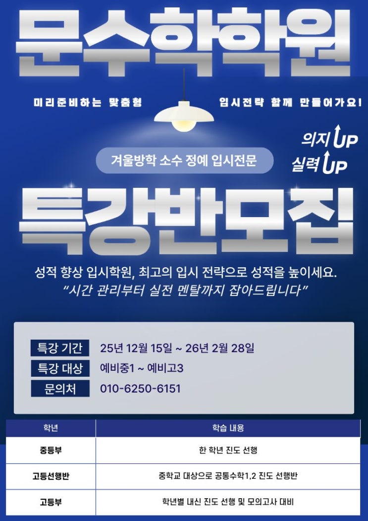 학년 구분 없는 특별반 개설 안내 안녕하세요. 유비스 학원에서는 학년과 관계없이 실력과 학습 의지를 중심으로 한 ‘특별반’ 수업을 새롭게 편성하여 운영하고자 합니다. 최근 미리 높은 학년의 수업을 듣고 싶어하는 학생, 현재 학년 수업보다 난이도 높은 심화 문제를 더 많이 접하고 싶은 학생들의 요청이 꾸준히 늘어나고 있습니다. 이러한 학습 니즈를 반영하여, 초등 ~ 중등 학생을 대상으로 한 학년 통합 특별반을 별도로 운영할 예정입니다. ✏️ 특별반 수업 대상 학년보다 한 단계 이상 앞선 선행 학습을 원하는 학생 기본 개념을 넘어 심화·응용 문제 풀이를 집중적으로 연습하고 싶은 학생 도전적인 학습 환경에서 사고력과....... <img src="https://blogthumb.pstatic.net/MjAyNTEyMzBfMjk0/MDAxNzY3MDc0NjY4NDk2.MTy1RhXHjrG6wv7o8AoLDkKOrqGGWGjigZ0V-qwiecsg.G1_REZ2MThMAS0ZKyjw9etTpEdkiZlyRopey5p1ydDMg.JPEG/%C6%AF%BA%B0%B9%DD.jpg?type=s3" />