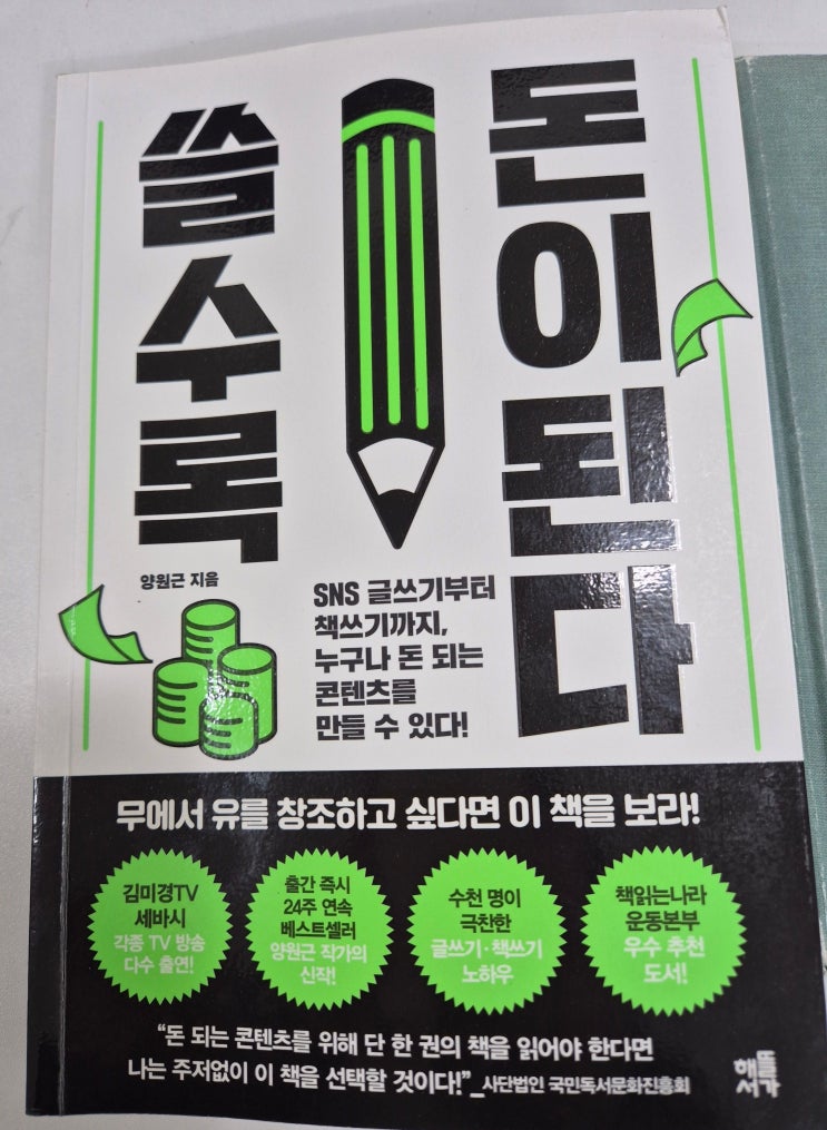 안녕하세요? 이천맘행복쌤 Amy입니다. 이번 주 우리 학생들이 2학기 기말고사를 본답니다. 주말까지 수업을 하느라 마음과 몸이 지쳐있습니다. 저는 이럴 때 책 한 권 읽으면 에너지가 충전됩니다. 가볍게 읽었지만 묵직한 마음의 숙제를 받은 책을 소개합니다. 학생들도 그렇지만 인풋만 한다면 우리는 그 지식을 알고 있는지 확신할 수가 없죠~ 아웃풋이 중요한 이유입니다. 자신이 알고 있는 지식을 말이나 글로 설명할 때 지식이 차곡차곡 쌓이는 기분 아시죠? 그런데 언제부터인지 글쓰기가 많이 힘들었습니다. 그래서 글쓰기 책을 몇 권 사서 보고 있습니다. 그중 오늘 소개할 책의 제목과 지은이입니다. 쓸수록 돈이 된다_양원근 지음 이....... <img src="https://blogthumb.pstatic.net/MjAyNTEyMTVfMzQg/MDAxNzY1ODA0MDQ5NDg1.zZo5Aef1hpvligIjbAcRRvQKzjsx0-6QCmNaBV6Q4Awg.Gf8eY8g9MtRnvbSTY5zwHfPz_nKdEEGcE28EwsNHSO0g.JPEG/20251215_215545.jpg?type=s3" />