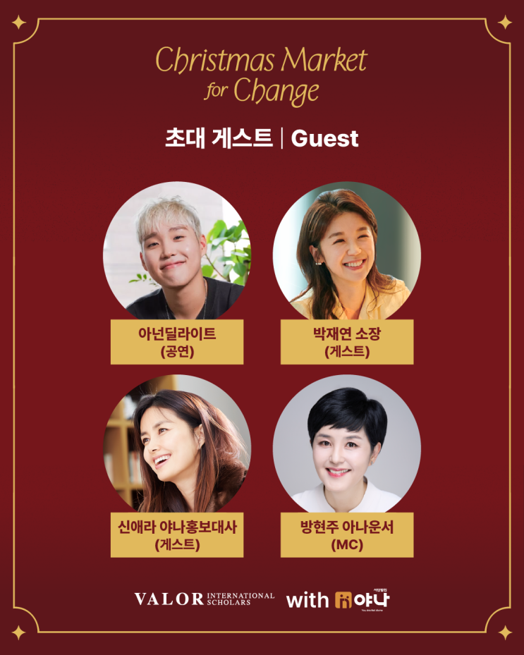 2025년 12월 16일(화), 삼정호텔 아도니스홀에서 열리는 Christmas Market for Change: VALOR X YANA 에는 따뜻한 마음과 메시지를 전해 줄 특별한 게스트와 공연이 함께합니다. 행사의 분위기를 깊고 풍성하게 만들어 줄 공연팀·게스트·MC를 소개합니다. 2025년 12월 16일(화) | 서울 강남 삼정호텔 아도니스홀 배움과 돌봄을 위한 크리스마스 마켓, 여러 브랜드가 함께 마음을 모아 아이들의 현재와 미래를 응원합니다. 본 행사에서 소개되는 제품들의 판매 수익은 청소년 돌봄기관 YANA와 베일러 One2One 교육 후원 프로그램을 위해 사용됩니다. <공연으로 나누는 위로와 기쁨: 아넌딜라이트> 섬세한 감성과 진심이 담긴 음악으로 많은....... <img src="https://blogthumb.pstatic.net/MjAyNTEyMTVfMTk3/MDAxNzY1Nzc3NTk5ODQ2.D7cBcDd5-91mu-4ZRXRwc5-YaqDiYXTBqSS2mAviKXEg.Ao9BkUWLV1e0txw-LWngZuW4WdB52RnARFOqYms2auQg.PNG/KakaoTalk_20251215_075157120_02.png?type=s3" />