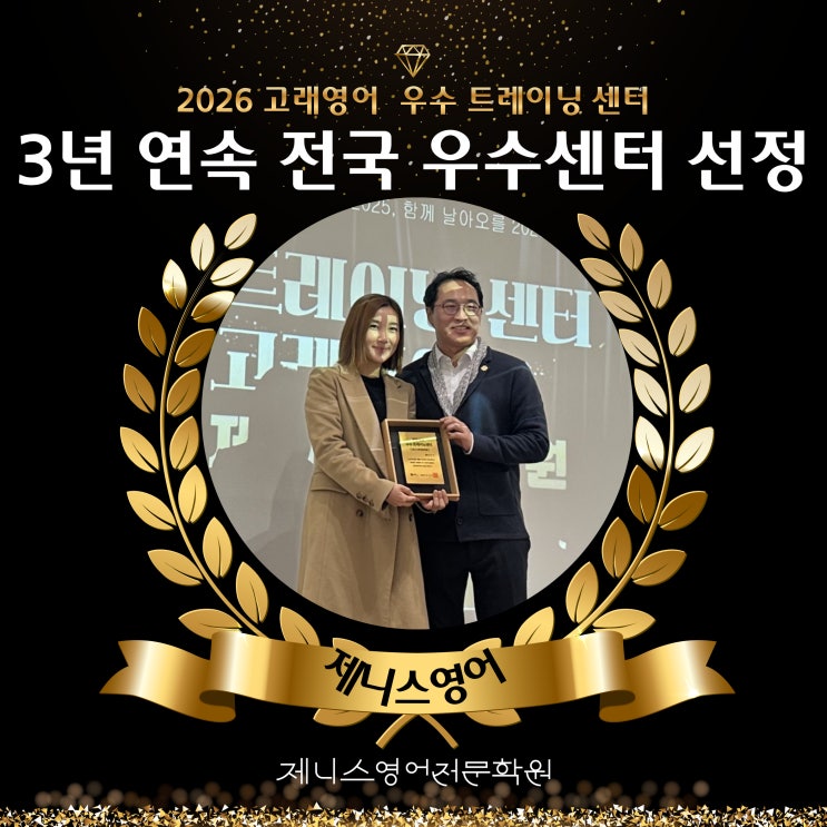 안녕하세요 ! 공도 초등학교 영어 전문 제니스 영어 입니다. 작년에 이어 올해도 2026년 고래영어 우수 트레이닝 센터로 선정되었습니다.!!!! 새김교육 대표님께서 시상을 해주셨어요 ❤️⭐️ 이 상의 영광을 당연히 저희 제니스영어 키즈들과 나누는게 마땅하다고 생각합니다. 재원생 부모님들고ㅏ 이 기쁨을 나누기 위해 떡을 준비했어요 전국 1등에 자리에 올 수 있었던 것은 다 믿고 맡겨주시는 학부모님들과 아이들의 열정이 있어야 한다고 생각합니다! 2026년도 공도 제니스 영어학원은 힘차게 시작할 준비가 되었습니다. 다가오는 한 해, 또 한번의 성장과 성취를 기대하겠습니다. 감사합니다! 작년 우수 트레이너 선정 관련 블로그....... <img src="https://blogthumb.pstatic.net/MjAyNTEyMThfNDIg/MDAxNzY2MDMzNDU5MzYy.h0XYxHTyhmvnS-kxABoSsrcM6iLPwvyXGxLrv-D7k5sg.m-DTL7z6tonlV2Lp3_9b0ME1C1pPyMoHLHeOTq1AcYkg.JPEG/%C1%A6%B8%F1%C0%BB-%C0%D4%B7%C2%C7%D8%C1%D6%BC%BC%BF%E4_-001_%285%29.jpg?type=s3" />