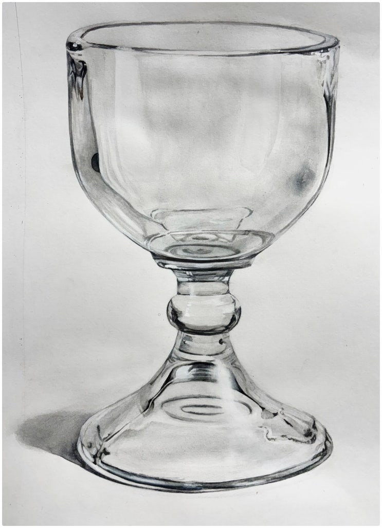 앞에서의 연필로 그린 그림을 수채화로 담백하게 표현한 학생의 그림입니다. ♣ 유리컵의 특징은 1. 자신의 고유색이 없다. 2. 가볍고 투명하게. 3. 표면의 매끈함과 약간의 반사가 있다. 4. 두께에 중첩과 굴절이 나타난다. 이 네 가지를 유념하면서 그리면 되겠습니다. 물론 원기둥을 기본으로 하는, 시점의 관계를 잘 지켜야겠지요. ♣ <img src="https://blogthumb.pstatic.net/MjAyNTEyMTlfMjc5/MDAxNzY2MTQ0MDcxMTgz.51B5Hc5_8lH3R4xYnijAuKmzvDZcU4ncjwM1G6y2vkgg.ElBZPyrSIu26PkIMG6-MheMybwo0Aet5Yj5n-KI_cygg.JPEG/KakaoTalk_20251219_202258345.jpg?type=s3" />