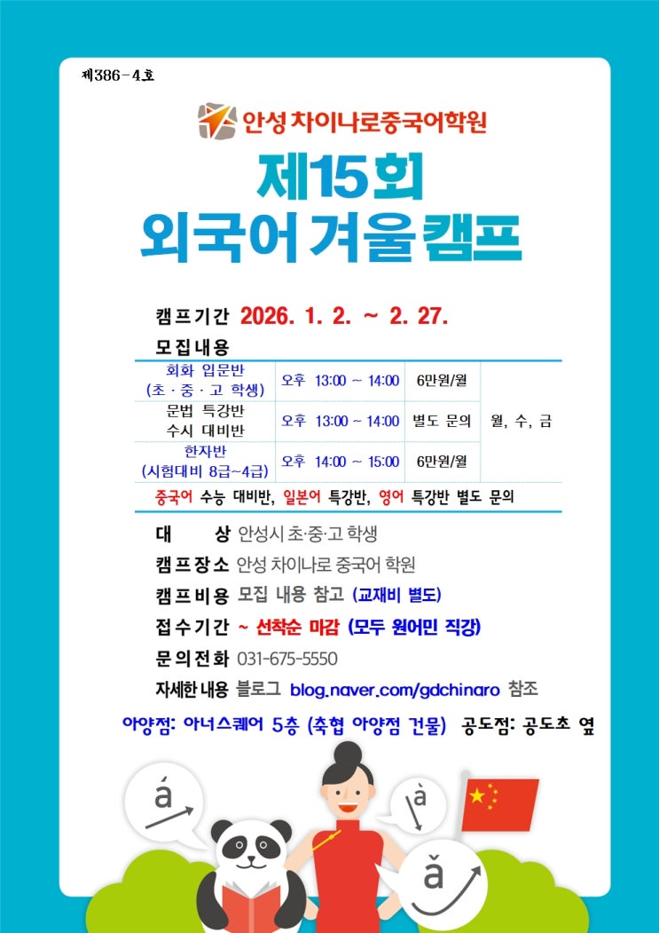 안녕하세요~~ 차이나로 원어민 외국어 (중국어 & 일본어 &영어)학원입니다. 어느덧 여름 & 겨울 캠프와 함께한 시간이 흘러, 많은 분들의 성원 덕분에 이번 겨울, 제15회 외국어 캠프를 진행하게 되었습니다. ✔ 원어민 강사 직강 수업 ✔ 듣기·말하기 중심 실전 외국어 ✔ 재미와 실력을 동시에 잡는 캠프 이번 겨울방학, 차이나로와 함께 외국어 실력을 키워보세요! 여러분의 많은 관심과 참여를 기다립니다 欢迎欢迎~ 수강 문의 안성점 031-675-5550 공도점 031-657-5551 <img src="https://blogthumb.pstatic.net/MjAyNTEyMjNfMjk4/MDAxNzY2NDc2Mzg5MjU1.hDBUPD4BnwqnGxMaADgdtrz5Ir5emhRYYF1ppDOjxDsg.7CgAqQaf65heuzk-qWMRH617bw1xexbFvmx4QB8s8c4g.JPEG/%C1%A615%C8%B8_%B0%DC%BF%EF%C4%B7%C7%C1.jpg?type=s3" />