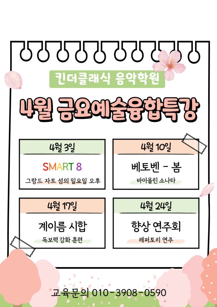 안녕하세요 김포 마산동 음악학원 킨더클래식 피아노학원입니다♪ 예술융합 전문 교육기관 킨더클래식음악학원에서는 음악이론과 작곡가 공부 등 어렵게 느낄 수 있는 공부도 더욱 재미있고 쉽게 배울 수 있도록 매주 금요일 피아노 연습 후 다양한 특강을 진행하고 있습니다 4월 3일 : 그랑드 자트 섬의 일요일 오후 SMART 8 4월 10일 : 바이올린 소나타 베토벤 - 봄 4월 17일 : 독보력 강화 훈련 계이름 시합 4월 24일 : 레퍼토리 연주 향상 연주회 따뜻한 봄날처럼 웃음과 음악이 가득한 시간 마산동 킨더클래식음악학원에서 아이들과 함께 특별한 추억을 만들어가겠습니다❤ 많은 관심 부탁드립니다 우리 아이들의 꿈이 자라는....... <img src="https://blogthumb.pstatic.net/MjAyNjA0MDFfMjMx/MDAxNzc1MDQzNjY4MDE3.KjCySzQrnmKw_clhL1pqivTcLFqK6iFGsVYSDEJF7f0g.HizgeTz1fZpB3gHoqtSyNKPo9XmQRCeu2NCA8Vw7bJMg.JPEG/%C1%A6%B8%F1%C0%BB_%C0%D4%B7%C2%C7%D8%C1%D6%BC%BC%BF%E4._%283%29.jpg?type=s3" />