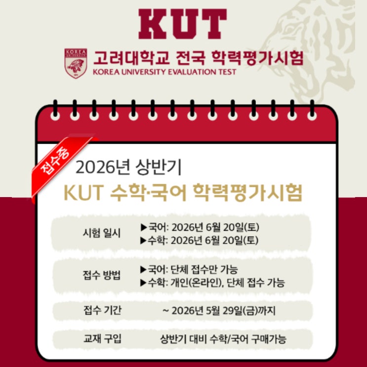 안녕하세요, 구래동 수학학원 하이레벨입니다 아이의 수학 실력을 객관적으로 점검하고, 한 단계 성장할 수 있는 기회인 2026 상반기 고려대학교 수학경시대회(KUT)를 안내드립니다. KUT는 현재 배우고 있는 교과 과정을 얼마나 잘 이해하고 있는지, 그리고 그 개념을 문제에 어떻게 적용할 수 있는지를 평가하는 시험입니다. 단순한 문제풀이 능력보다 개념 이해와 사고력을 중요하게 보는 대회입니다. 저희 학원은 2023년부터 꾸준히 참가하여 올해로 7번째 참여를 이어가고 있습니다. 그동안 많은 학생들이 이 과정을 통해 수학에 대한 자신감과 도전 경험을 쌓아왔습니다. KUT는 여러 경시대회 중에서도 난이도가 비교적 부담이 적은 편으로....... <img src="https://blogthumb.pstatic.net/MjAyNjAzMzFfODIg/MDAxNzc0OTYxMTA0NDgy.Yls3H7NOGboae4XfKgjSVpOIywzoUXEafEKpQtFbuikg.tsCUA3KwcKk2R5vN4Wu5sJswXV1Tdv0OrpqGx3BX7jgg.JPEG/2026%BB%F3%B9%DD%B1%E2KUT%BC%F6%C7%D0%C7%D0%B7%C2%C6%F2%B0%A1_1.jpg?type=s3" />
