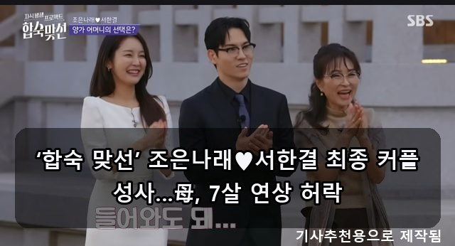 최근 연예계 소식을 모아봤습니다. SBS 예능 '합숙 맞선'에서 조은나래 씨와 서한결 씨가 최종 커플로 맺어지며 많은 이들의 축복을 받았습니다. 특히 이번 최종 선택에는 '합숙 맞선'만의 특별한 규칙이 적용되어 흥미를 더했습니다. 한편, 그룹 AOA 출신 권민아 씨는 제작자로 변신하여 댄스 인재 발굴에 나선다는 소식입니다. 과거의 아픔을 딛고 새로운 길을 걷는 그의 도전에 응원의 메시지가 이어지고 있습니다. 마지막으로, 이찬원 씨의 겨울 노래 '오늘은 왠지'가 '2026 TMA 베스트 뮤직 – 겨울' 부문에서 1위를 차지하며 변함없는 인기를 과시했습니다. ‘합숙 맞선’ 조은나래♥서한결 최종....... <img src="https://blogthumb.pstatic.net/MjAyNjAyMDZfMTQx/MDAxNzcwMzYwMjQ1NTk4.MmHBGysBDxHIgvZSKymvwIszZlGred8ok5N0oNPN7AMg.V8bjeRxTmheZIrZpM5-MZmqW53lwwmFinc5OUQPMzbsg.PNG/image.png?type=s3" />