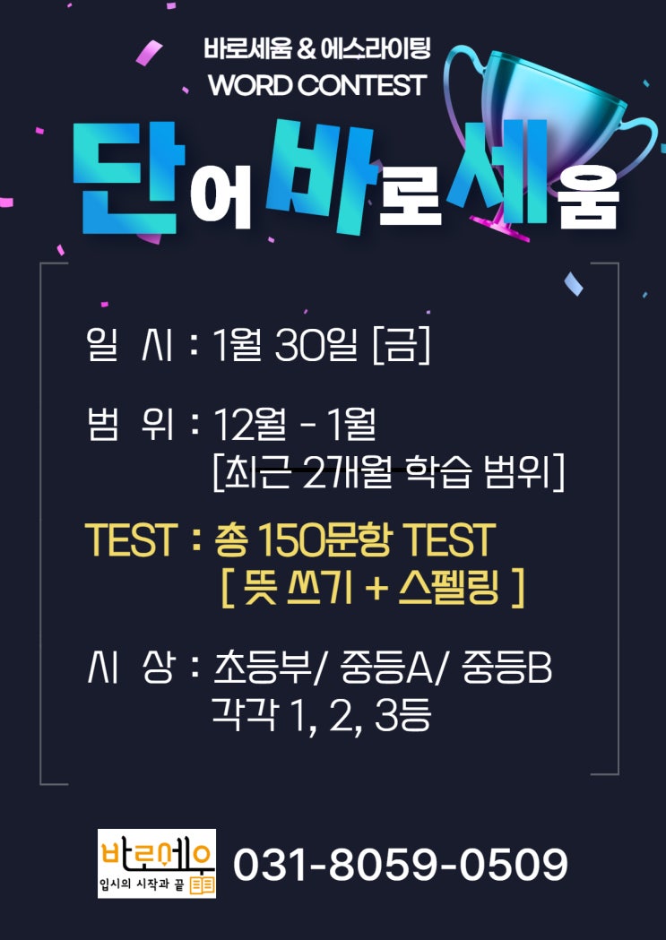 초·중등 단어 실력, 실전으로 점검하세요! 바로세움 단.바.세 CONTEST(단어 바로 세움 컨테스트)가 열립니다. 영어 학습의 기본이자 가장 중요한 단어 실력! 그동안 배운 단어를 얼마나 정확히 이해하고 기억하고 있는지 직접 확인할 수 있는 초·중등 WORD CONTEST를 진행합니다. ✔ 일시 1월 30일 (금) ✔ 출제 범위 12월 ~ 1월 학습 내용 (최근 2개월 학습 범위 기준) ✔ 테스트 구성 총 150문항 뜻 쓰기 스펠링 테스트 단순 암기가 아닌, 정확한 의미 이해 + 철자 실력까지 꼼꼼하게 평가합니다. 왜 단어 콘테스트인가요? ✔ 단어 학습 성취도 점검 ✔ 시험 대비 기본 실력 강화 ✔ 학습 집중력 & 자신감 향상 ✔ 경쟁이 아닌 성....... <img src="https://blogthumb.pstatic.net/MjAyNjAxMTVfMjk4/MDAxNzY4NDU0NTU5ODM2.AlFauoxthJ4PWu2wIl4YC7GuF2iY0eoDE_Pwr0f35yEg.BM9eryHnXoQKKj5QE9VDk0szkl14BLtqEjXV0ygBfXMg.JPEG/%C1%A6%B8%F1%C0%BB_%C0%D4%B7%C2%C7%CF%BC%BC%BF%E4_%281%29.jpg?type=s3" />