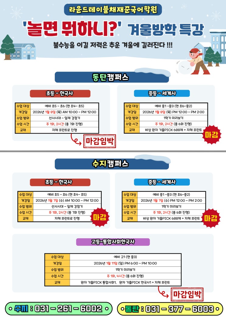 ⭐️ '놀면 뭐하니?' 2026 겨울방학 특강 - 초등한국사 (마감임박 - 신청 가능) / 중등세계사 (마감) ⭐️ ⭐️ '놀면 뭐하니?' 2026 겨울방학 특강 - 초등 한국사 특강 (마감 임박 - 신청 가능)⭐️ 2026 겨울방학 초등 한국사 특강 '역사'가 반복되듯 '역사 공부'도 반복돼야 합니다‼️‼️ 겨울방학 7주 완성 ‼️‼️ 한국사 개념 잡기 성공 ‼️‼️ 1️⃣ 네이버 밴드를 활용하여 현장 라이브 강의, 녹화 강의, 질의 응답 제공 ✅ 수업 대상 : 예비 초5 ~ 초6 ✅ 개강일 : 2026년 1월 8일 (목) AM 10:00 ~ PM 12:00 ✅ 강사 : 임보윤 선생님 (한국외대교육대학원 졸업 / 대치동 다원교....... <img src="https://blogthumb.pstatic.net/MjAyNjAxMDNfMTEg/MDAxNzY3NDIxMzcwNjUx.pfJUxBPWun-yAfUO7eEfjpjETPRI5LCG81NaK0n-enog.mBifJKxZ-Jyt-v_o3xYQ7R3W86s16OdCAH0oZCGd9OYg.JPEG/001.jpg?type=s3" />