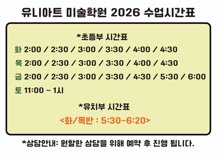 병점점)유니아트미술학원 2026년 수업시간표 입니다.