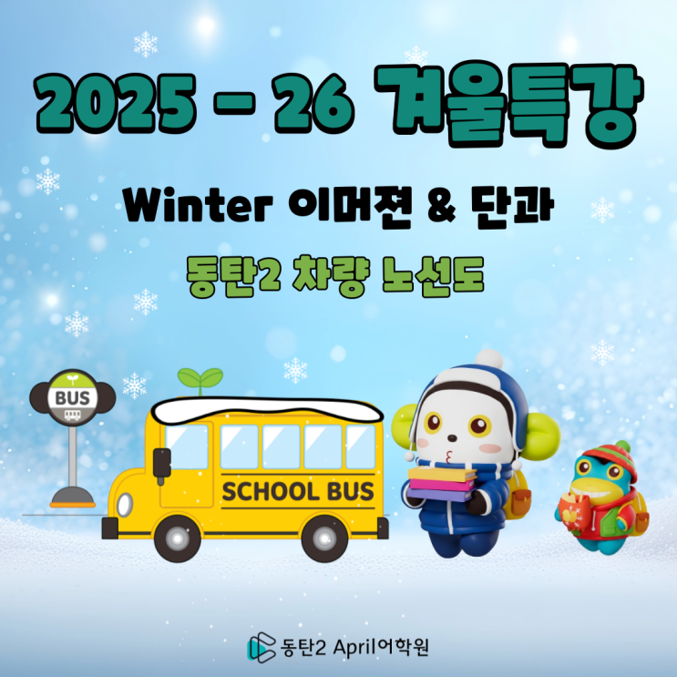 동탄2영어학원 | 동탄2 초등영어 동탄2 에이프릴어학원 ☆ 2025-26 겨울 이머젼 차량안내 ☆ April Winter Immersion School과 함께 신나고 즐거운 겨울 방학을 알차게 보내보아요. 수업 시작 전 차.량. 노.선.표 확인을 꼭! 해 주세요. ☆ 25-26년 겨울이머젼 차량 안내 ☆ ※이미지의 원본보기를 클릭해주시면 크게 보실 수 있습니다※ ★ Winter Immersion School: 1월 12 (월) ~2월 6일 (금) ★ Winter Intensive Class [단과특강] 월수반 -> 1월 12일, 14일, 19일, 21일26일,28일 / 2월 2일, 4일 [ 총 8회 수업] 화목반 -> 1월 13일, 15일, 20일, 22일 27일, 29일 / 2월 3일 ,5일[총 8회 수업] ★중요 사항 ★ ※ 방학특강/ 이머젼학....... <img src="https://blogthumb.pstatic.net/MjAyNjAxMDdfMTQ3/MDAxNzY3NzcxMDQxMjY5.GK7CK6ceKnCZv3DMPn2u2T0w5EZPOXecOw-A5xvs6tIg.OjNB430Jb7TtxmLZz9G_aszUjjiJ5Elx_bAupNJpsEUg.PNG/%C6%AF%B0%AD%C2%F7%B7%AE-001.png?type=s3" />