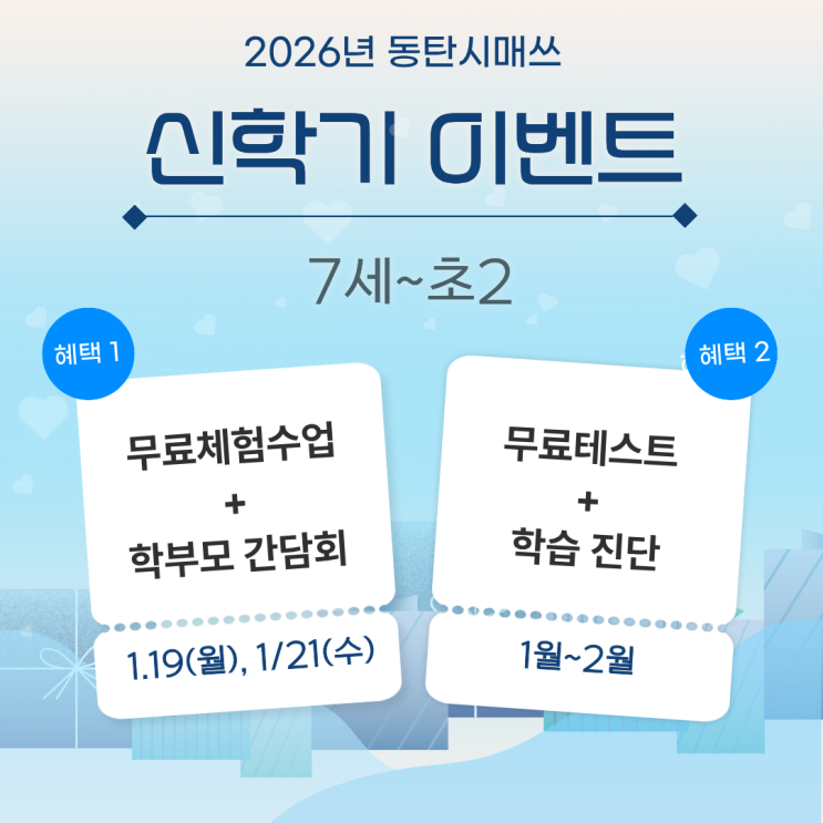 2026년 학생들의 신학기를 응원합니다! 동탄시매쓰 신학기 이벤트 *대상학년* 7세~초1 이벤트 신청 https://pf.kakao.com/_qFFxhK ✅무료체험수업✅ 딱딱하고 어렵기만한 수학이 아닌 두뇌가 자극되는 사고력수학 체험수업 일정 1.19(월) 3시40~4시30 1.21(수) 6시40~7시30 ✅무료테스트✅ 수학적 사고 영역 등을 종합적으로 측정하여 아이의 잠재된 수학 능력과 현재의 상태를 파악 할 수 있는 무료테스트권 지급(2만원 상당) 기간 2월말까지 ✅학부모 간담회✅ ✔수학 교과과정부터 시매쓰 커리큘럼과 로드맵 제공! ✔학부모님들이 궁금해하는 시매쓰 수업과 시매쓰의 모든 것! Q&A 시간 무료체험수업 신청 *타임별 선착순....... <img src="https://blogthumb.pstatic.net/MjAyNjAxMTNfMTE5/MDAxNzY4MzA2MjQyMjg4.Dd6xjXcnXR_QkNbf7e_z5jQDUuuhEw44DUZdhQxXnVsg.5_EERENhZJVMgwanTEwg8zWe-gbzBB_lWGjNmT6_Cmgg.PNG/%C1%A6%B8%F1%C0%BB_%C0%D4%B7%C2%C7%D8%C1%D6%BC%BC%BF%E4._%2812%29.png?type=s3" />