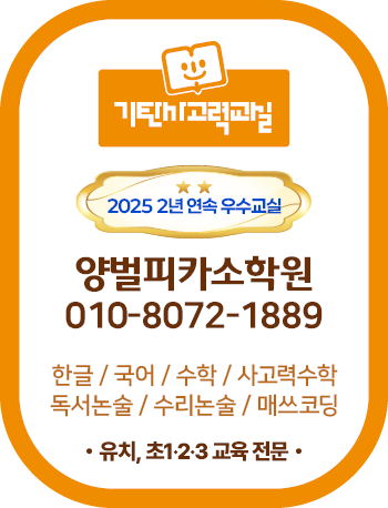 안녕하세요! 양벌동 교육의 중심, 양벌피카소학원입니다. 오늘은 저희 원의 아주 기쁜 소식을 전해드리려고 해요. 저희 학원이 2025년 운영평가에서 무려 **'2년 연속 우수교실'**로 선정되었습니다! 양벌초공부방을 찾으시는 학부모님들과 매곡초공부방을 고민하시는 분들께 꾸준히 신뢰를 드린 결과라고 생각되어 더욱 뜻깊습니다. ✨ 왜 양벌동 기탄 피카소일까요? 저희는 아이들이 공부를 지루한 숙제가 아니라 즐거운 놀이처럼 느낄 수 있도록 지도합니다. 양벌동 기탄만의 탄탄한 커리큘럼은 이미 입소문이 자자한데요. 특히 양벌초공부방 중에서 아이들이 가장 즐겁게 다니는 곳으로 손꼽히기 위해 매일 최선을 다하....... <img src="https://blogthumb.pstatic.net/MjAyNjAxMTZfMjA0/MDAxNzY4NTI1OTA4OTk4.J8H3qLraeEPThgLzpMIWezsf9spv4Ch-mbsJ3_F0F2Ig.8_WhYCqqekiZ79L6wUcD_ByddrKlN9e8_8c9mxM4Ll0g.PNG/1768438937146.png?type=s3" />