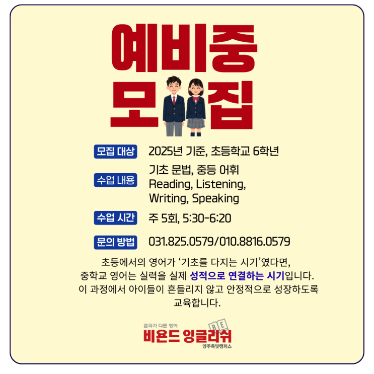 안녕하세요 결과가 다른 영어 비욘드 잉글리쉬 옥빛 캠퍼스입니다. 아이의 영어는 시작점이 다르고, 필요한 방향도 전혀 다릅니다. 그래서 저희는 예비초1과 예비 중1을 같은 방식으로 가르치지 않습니다. 예비 초1에게는 영어가 ‘공부’가 되기 전, 소리와 문장에 자연스럽게 익숙해지는 시간이 필요합니다. 억지 암기 대신, 말하고 듣고 따라 하며 영어를 편안한 언어로 받아들이게 합니다. 예비 중1에게는 지금까지 쌓아온 영어를 문법과 독해, 내신 중심의 실력으로 정리하는 전환기가 필요합니다. 중학교 수업을 버틸 수 있는 기본기, 시험에서 흔들리지 않는 구조 이해부터 차근히 다집니다. ✔ 학년별 목표가 분명한 수업 ✔ 반복으로 실....... <img src="https://blogthumb.pstatic.net/MjAyNTEyMTZfMjEg/MDAxNzY1ODcyNDE4NjYw.gZrFo0D-5gZk1TyiUpvWUstQnx_GOYHcoGgMu4gP11Qg.bELQLlD3b4XBoK5jOCq4zBWDiD7SF2mkQdnPng0SF8Qg.PNG/1.png?type=s3" />