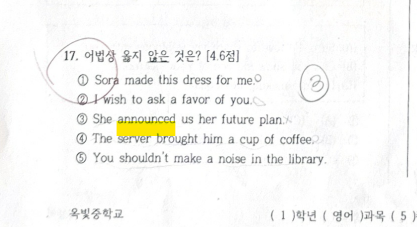 안녕하세요, 바라던 영어학습의 시작 신영어입니다. 25년 옥빛중 1학년 2학기 기말고사 시험지에서 가장 논란이 되었던 문제를 분석합니다. 시험 범위에 4형식 수여동사가 포함되어 있어 대부분의 학생들이 4형식을 3형식으로 전환하는 연습에 집중하며 시험을 준비했을 것입니다. 그러나 신영어는 한 단계 더 나아간 학습을 제공했습니다. 학교 프린트를 분석하여 자체 제작한 교재를 활용해, 3학년 수준의 핵심 개념까지 체계적으로 훈련시켰고 그 결과 시험 준비 과정과 정확히 일치하는 문제를 통해 학생들은 자신의 실력을 충분히 발휘할 수 있었습니다. 많은 학생들이 정답의 이유를 명확히 설명하지 못한 반면, 신영어 학생들....... <img src="https://blogthumb.pstatic.net/MjAyNTEyMTlfMyAg/MDAxNzY2MTMxNTU0ODM2.hnZjC9te-9HTlrUCx4bolR6lIpo4BGaa6QhF85zrqSgg.F2ilDAxUDW0r2F4oYi8uEJLUiH04PuROYyp2sy4pm0og.PNG/%BF%C1%BA%FB%C1%DF1%BD%C3%C7%E8%C1%F6.png?type=s3" />