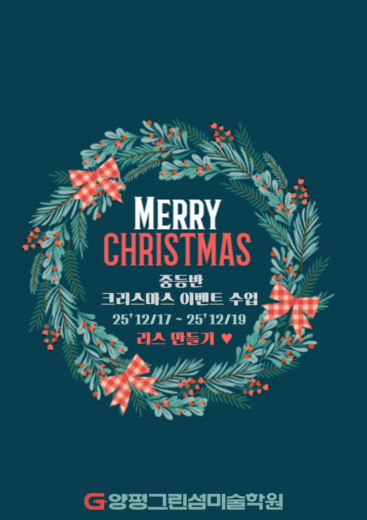 중등반 크리스마스 이벤트 수업 – 리스 만들기 연말 분위기가 물씬 느껴지는 12월, 양평그린섬미술학원 중등반에서는 **크리스마스 이벤트 수업 ‘리스 만들기’** 를 진행했습니다 ✨ 수업 준비 – 재료부터 크리스마스 분위기 가득 아이들이 사용하는 재료는 초록 모루, 진주 비즈, 크리스마스 오너먼트, 리본, 장식 체인 등 실제로 만졌을 때 촉감이 살아 있는 재료들로 구성했습니다. 같은 재료를 사용해도 배치 방법, 밀도, 장식 위치에 따라 전혀 다른 분위기의 리스가 완성되기 때문에 중등반 아이들에게 특히 잘 어울리는 수업이에요. ✋ 제작 과정 – ‘감기 → 쌓기 → 균형 잡기’ 1️⃣ 기본 링에 모루를 감아 형태....... <img src="https://blogthumb.pstatic.net/MjAyNTEyMzFfMTcz/MDAxNzY3MTc2NTk0NDky.VNo6xHGcQpUb0J09slgAFbzeMzBFARe7aA3Yfc4yEG8g.ACN_ZRgQawHf4EwCXjUXQmGHH4wxBhKFDAut8JW8QSog.JPEG/%C1%A6%B8%F1_%BE%F8%C0%BD-%A4%B5%A4%B5%A4%B5.jpg?type=s3" />