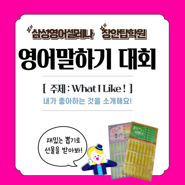 안녕하세요 장안동 영어학원 삼성영어 안평로즈학원입니다 2026년의 새로운 계획들로 설레는 요즘이죠? 공부도 즐거워야 실력이 쑥쑥 늘어나는 법! 우리 삼성영어 안평로즈 친구들이 즐겁게 등원할 수 있도록 준비한 '2026 연간 이벤트' 소식을 들고 왔습니다! 2026년, 우리 아이들의 꽉 찬 성장 스케줄! 올해는 아이들의 학습 동기를 부여해 줄 다채로운 행사들이 정말 많아요. 겨울 & 여름 방학: 실력을 탄탄하게 잡아줄 방학 특강과 나성실 이벤트가 준비되어 있어요! 봄 (3~5월): 예쁜 글씨 이벤트부터 긴장감 넘치는 스피킹비, 그리고 기다리고 기다리던 어린이날 행사까지! 여름 (7~8월): 단어 실력을 뽐내는....... <img src="https://blogthumb.pstatic.net/MjAyNjAyMTBfMjQ1/MDAxNzcwNjkwNDc0MTY0.YoB9XZZ0hhitfxfcoBPrImo2_Y0te7n17a5C-IkBV38g.Adzzs-xtDBf5PaO9ytTOxEp-MphVUjn8t1JywEK0w_gg.PNG/%BB%F3%B4%E3%B9%AE%C0%C7%C0%FC%C8%AD_%BA%B9%BB%E7%BA%BB-001.png?type=s3" />
